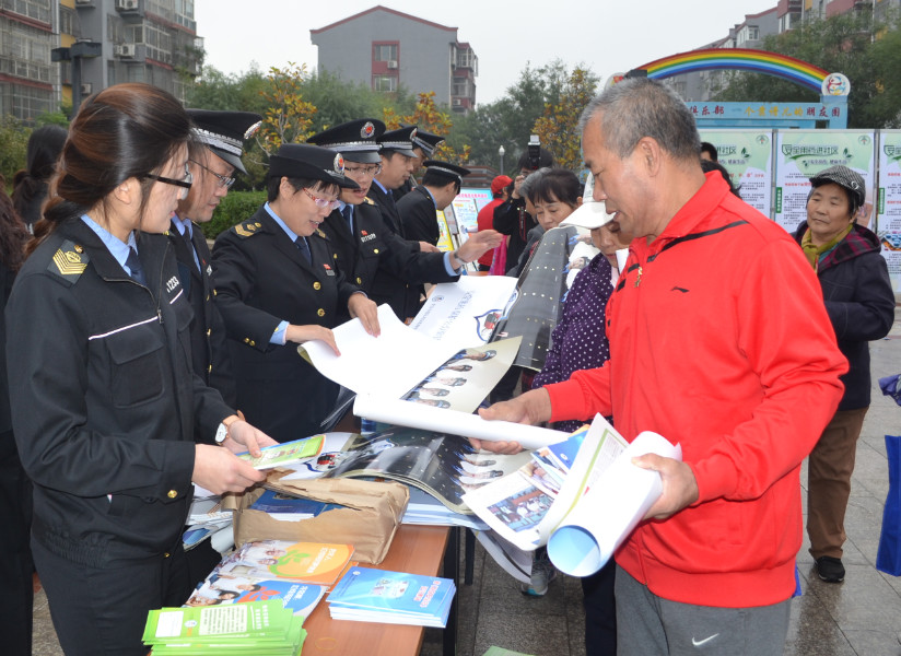 图为顺义区食药监管局工作人员向居民发放宣传资料。 王东海 摄