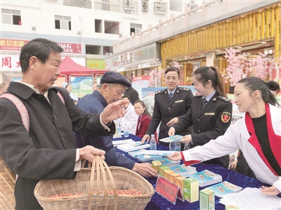 3月30日,贵州省铜仁市石阡县市场监管局工作人员在该县西门广场向群众发放食品药品安全知识宣传材料。 本报记者 蒙水 通讯员 马竹围 摄影报道