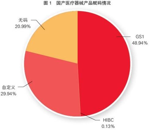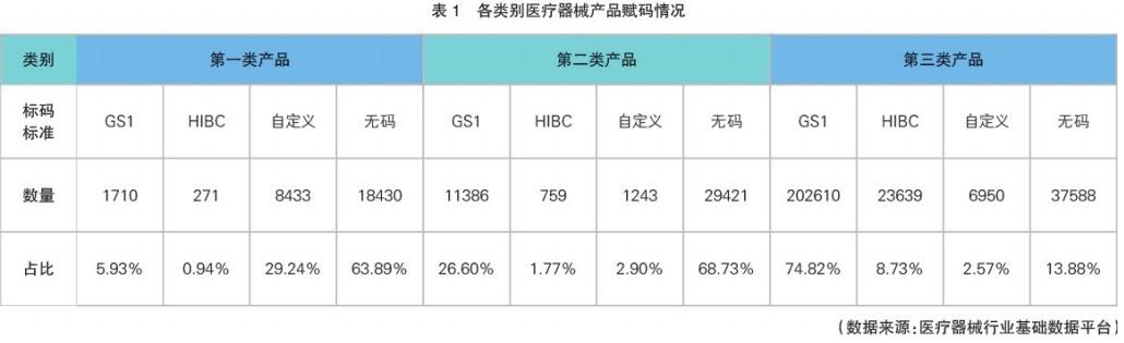 从产品管理类别看,第三类医疗器械赋码率最高,约占86%,其中使用GS1和HIBC编码的产品约占83%;第一类、第二类医疗器械的赋码率较低(见表1)。