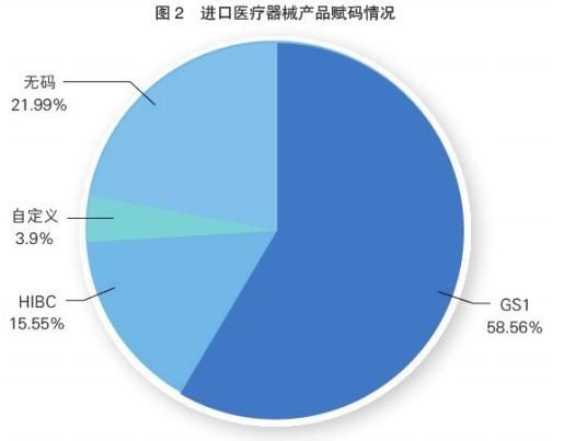 随着全球医疗器械监管机构对UDI的高度关注,我国医疗器械行业对UDI的认知也不断提升,医疗器械产品的赋码比例逐步提高。值得注意的是,国产、进口医疗器械的赋码率总体差异不大,赋码产品约占80%,无码产品约占20%。但国产医疗器械采用自定义编码的现象比较普遍,约占30%,而进口医疗器械约占4%。