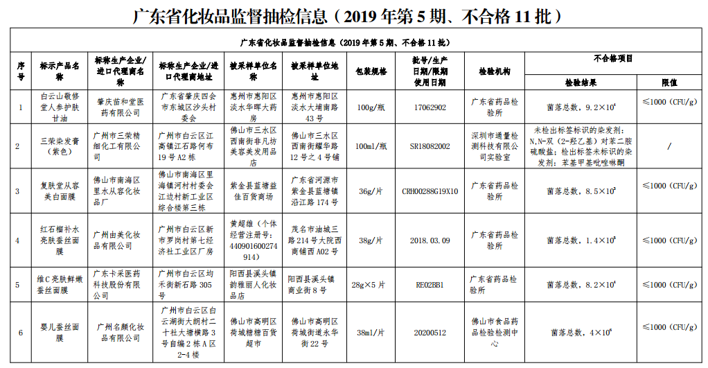 中国质量新闻网讯 11月15日,广东省药品监督管理局官网发布通告称,根据《关于印发 2019 年广东省化妆品抽检工作计划的通知》(粤药监办执法〔2019〕45 号)的要求,广东省药品监督管理局组织开展了化妆品监督抽检工作。2019年第5期全省对526批次化妆品进行了抽检,经检验,合格产品515批次,不合格产品11批次。
