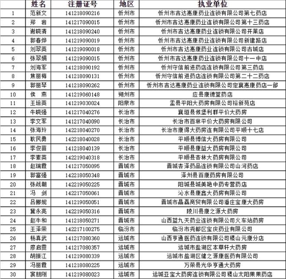 根据《国家药监局关于开展药品零售企业执业药师“挂证”行为整治工作的通知》(药监综药管〔2019〕22号 )要求,山西省各级药品监管部门开展打击执业药师“挂证”专项整治工作。经各市市场监督管理局核查上报,30名执业药师存在“挂证”行为,依据国家药监局、人力资源社会保障部印发的《执业药师职业资格制度规定》第28条规定,山西省药监局对其执业药师注册证书予以撤销。