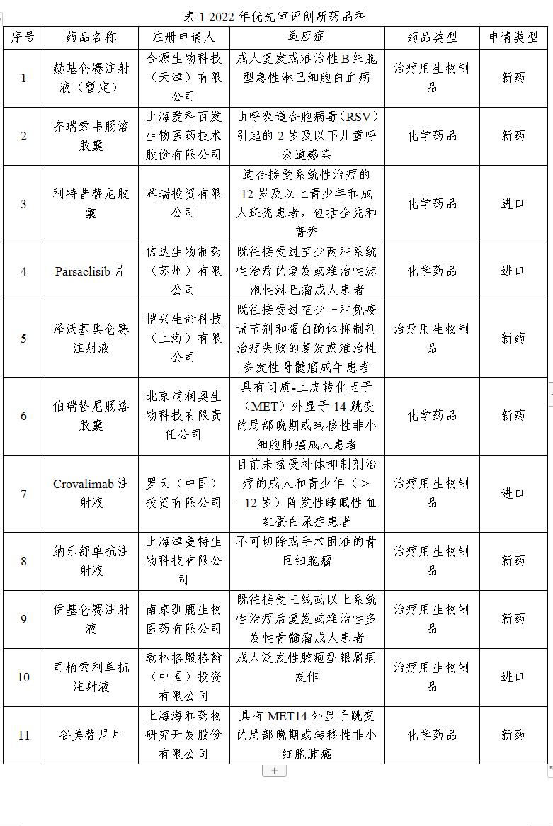 综上所述,2022年共12件创新药被纳入优先审评名单,覆盖11个品种,如表1所示。其中,包括5种化学药品和6种治疗用生物制品;4种创新药为进口药品,其他均来自本土药企。