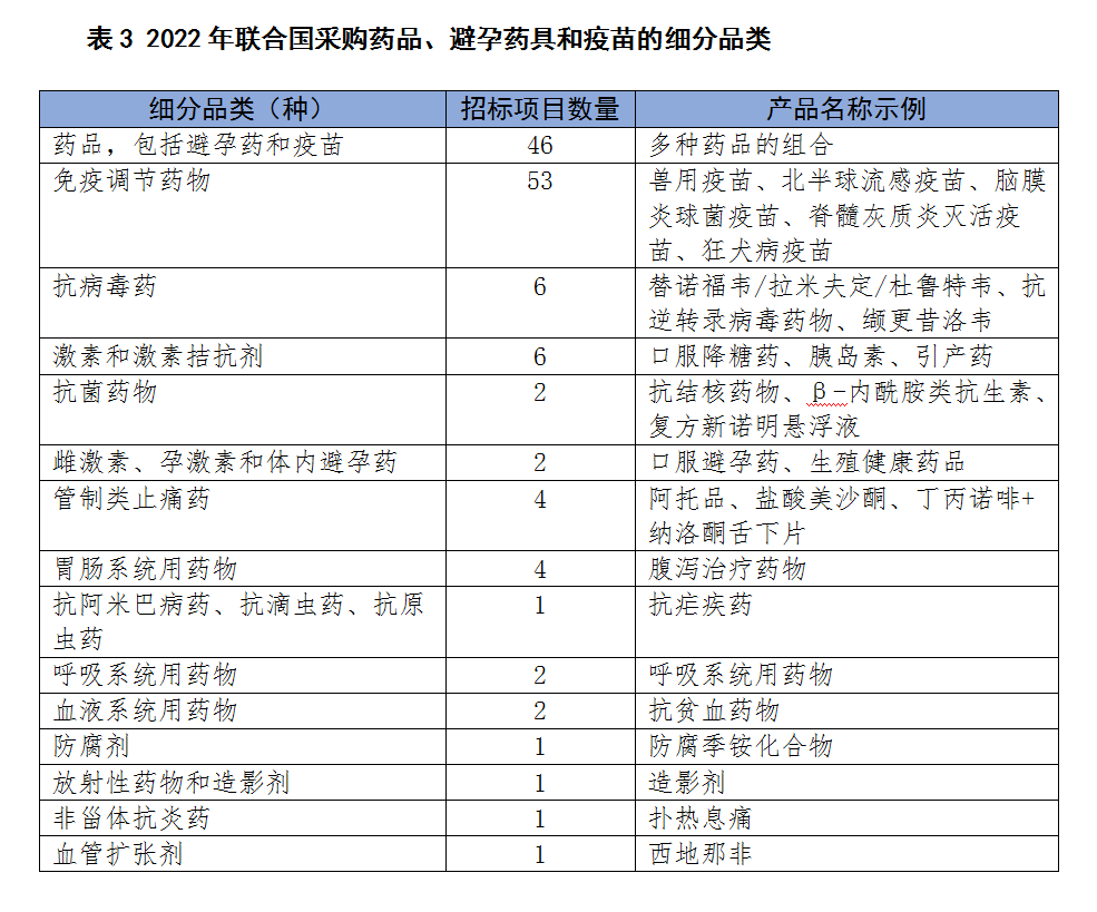 总体来说,2021—2022年,中国医药产业在联合国采购的舞台上大放异彩,既有足够供给全球基础医疗物资的产能,也有达到国际标准的研发能力。2021年,3款中国自主研发的新冠病毒疫苗通过WHO EUL(紧急使用清单)认证,被联合国机构采购,即为例证。