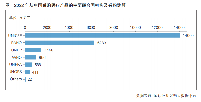 2022年,中国在联合国采购中供应了5亿美元的产品,占联合国采购总额的1.69%,排名由2021年的第3名跌至第15名。2022年共有13个联合国机构从中国采购医疗产品,采购额达2.29亿美元。其中,最主要的采购类别为医疗器械及设备,采购额为1.4亿美元;其后是药品、避孕药具和疫苗,采购额为8900万美元。UNICEF的采购金额最高,达1.4亿美元,占比高达61%。