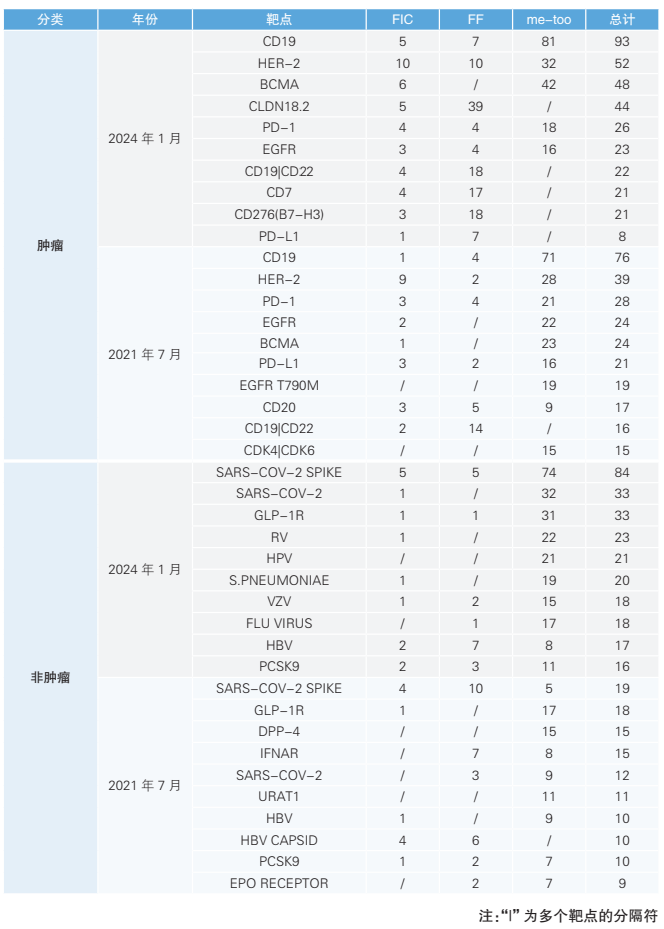 表 2021 年 7 月与 2024 年 1 月我国在研管线中肿瘤与非肿瘤治疗药物的前十大靶点情况