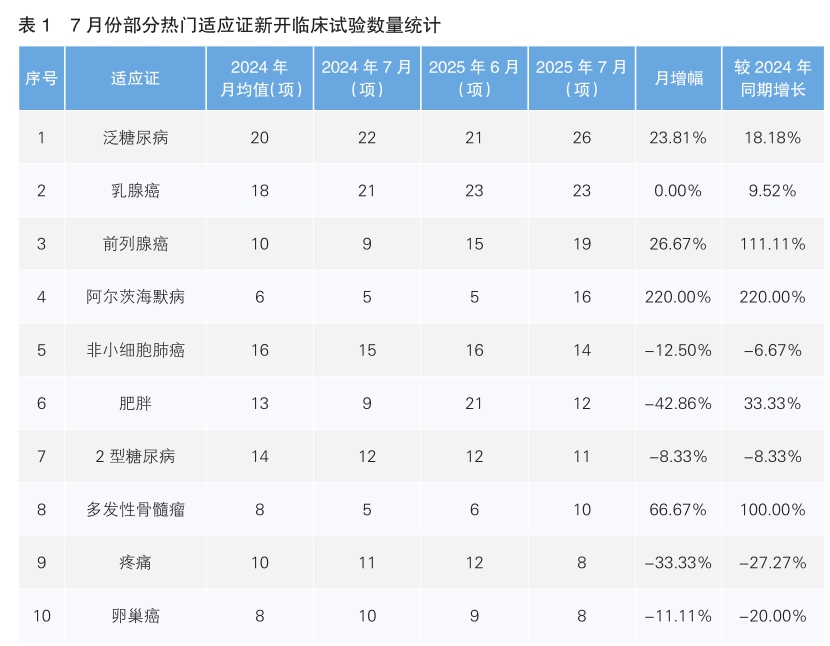 从7月份新开临床试验热门适应证来看,泛糖尿病为最主要的热门研发领域,新开临床试验26项,环比上涨23.18%,同比上涨18.18%。其次为乳腺癌,新开临床试验数量与6月份持平,与去年同期相比上涨9.52%。值得注意的是,7月份新开临床试验数量上升幅度最大的热门适应证为阿尔茨海默病,由6月份的5项上升至16项,上升幅度为220.00%;数量下降幅度最大的适应证为肥胖,由6月份的21项下降到12项,下降幅度为42.86%。(详见表1)