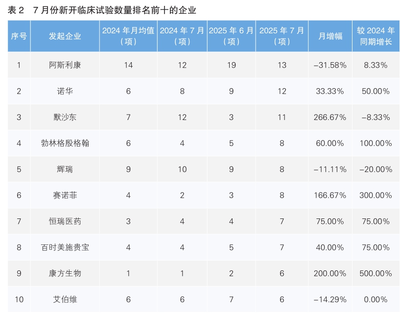 7月份新开临床试验数量排名前三的企业分别为阿斯利康、诺华和默沙东,数量分别为13项、12项、11项。