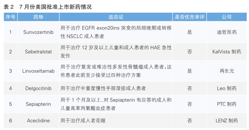 7月份,美国批准上市6款新药。根据Pharmadigger数据库,Sebetralstat和Aceclidine为全球范围内首次批准。(详见表2)