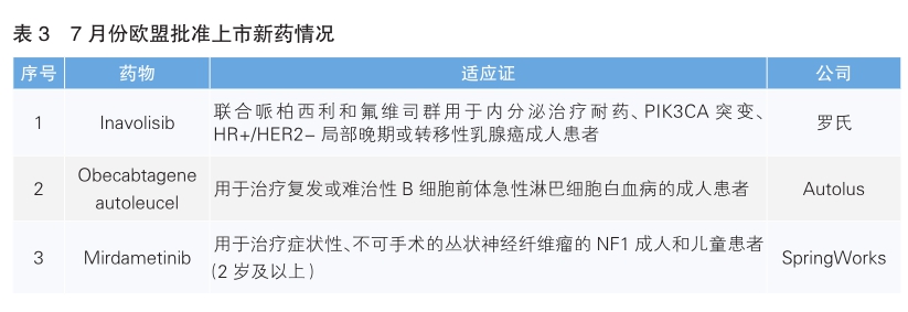 7月份,欧盟批准3款新药上市。根据Pharmadigger数据库,均非全球范围内首次批准。(详见表3)