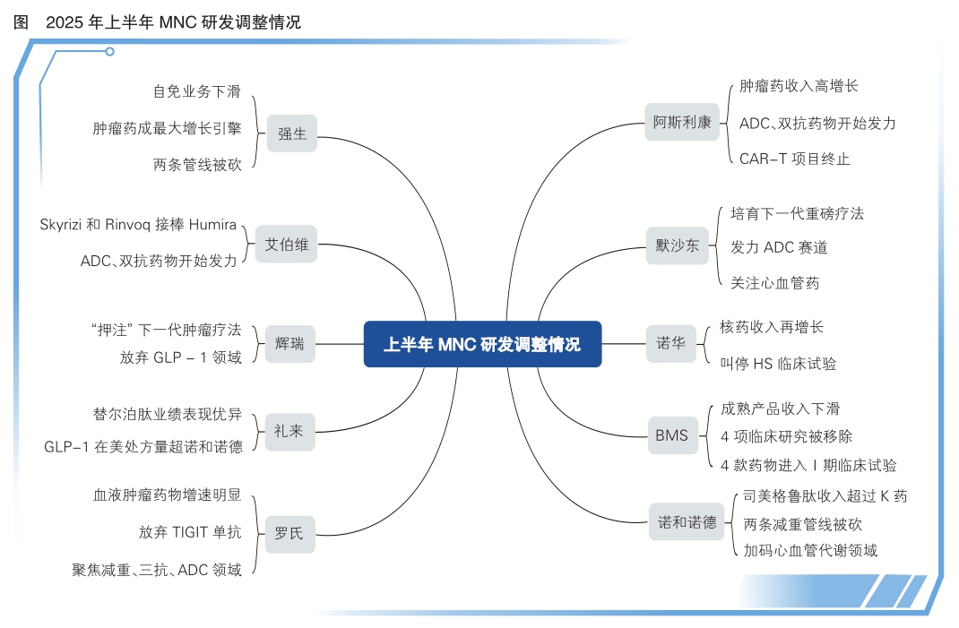 上半年,跨国药企的研发动向呈现出鲜明的技术迭代与战略重构特征。在靶向治疗深化与专利悬崖压力的双重驱动下,双抗、ADC、基因疗法、核药等前沿领域成为核心赛道。与此同时,管线优化与战略收缩成为普遍动作。这一趋势反映出MNC发展策略从“广泛撒网”转向“精准卡位”。对于减重管线的战略布局同样趋于冷静,这是市场阶段性发展的必然导向。