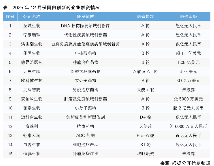 2025年12月份15家国内创新药企业完成新一轮融资 最高单笔融资超1.1亿美元,涉及小核酸药物等研发领域