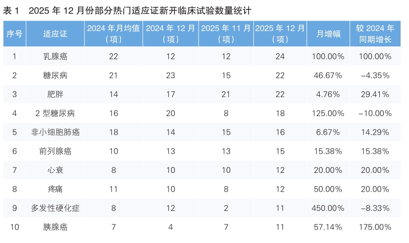 从2025年12月份新开临床试验适应证来看,乳腺癌为最热门的研发领域,新开临床试验24项,环比同比均翻一番。值得一提的是,2025年12月份针对热门适应证新开临床试验数量环比均呈上升趋势,其中多发性硬化症上升幅度最大,新开临床试验11项,环比增长450%。(详见表1)