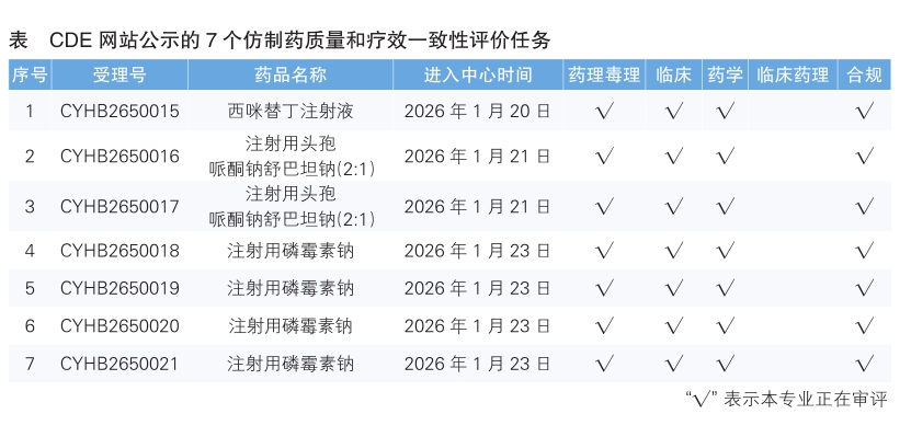 8.CDE网站公示7个仿制药质量和疗效一致性评价任务(详见表),涉及西咪替丁注射液等品种。