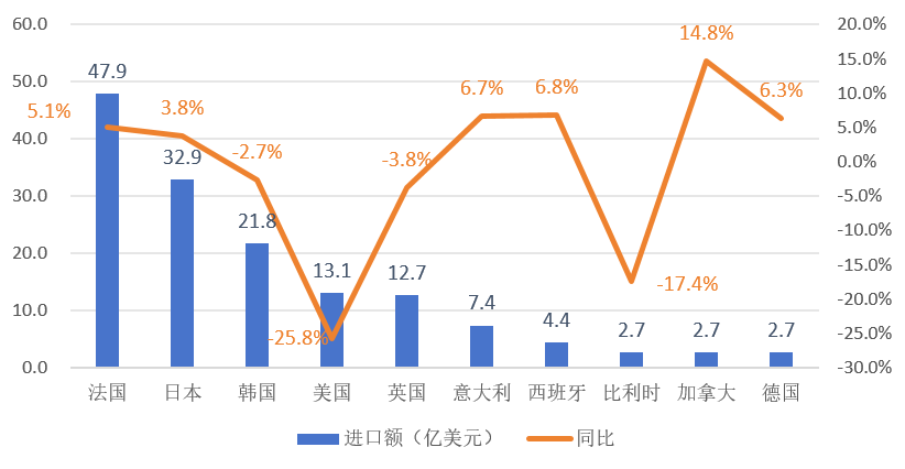 图1 2025年中国化妆品十大进口来源地进口额情况