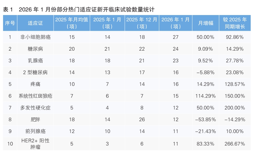 从1月份新开临床试验热门适应证来看,非小细胞肺癌为最热门的研发领域,新开临床试验27项,环比上升50%,同比上涨92.86%。其次为糖尿病,新开临床试验数量为24项,环比上升9.09%,同比上涨14.29%。值得注意的是,1月份新开临床试验数量上升幅度最大的热门适应证为系统性红斑狼疮,由去年12月份的7项上升至15项,上升幅度为114.29%;新开临床试验数量下降幅度最大的热门适应证为肥胖,由去年12月份的26项下降到12项,下降幅度为53.85%。(详见表1)