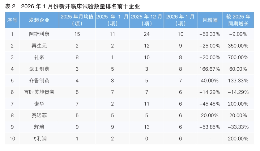 对新开临床试验的发起单位进行统计后发现,1月份发起临床试验最多的企业是阿斯利康,新开临床试验10项,环比下降了58.33%。其次为再生元,新开临床试验9项,环比下降了25%。新开临床试验数量上升幅度最大的企业为武田制药,环比上升了166.67%。值得注意的是,1月份我国药企齐鲁制药进入新开临床试验数量排名前十榜单,新开临床试验7项,环比增长40.00%,同比增长133.33%。(详见表2)